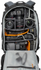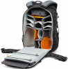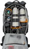 In der Rückenöffnung befinden sich transparente Reißverschlusstaschen sowie ein CradleFit-Fach für Laptops, das Platz für ein 16-Zoll-MacBook Pro bietet. Die seitlichen Öffnungen sind mit großen, erweiterbaren Außentaschen ausgestattet, die eine Flasche bis zu 1 l aufnehmen können, und sind am Boden verstärkt, um ein Stativ zu stützen. Zusätzliche Schlaufen und Taschen an den Oberseiten ermöglichen einen schnellen Zugriff auf das Material und eine sichere Befestigung des Stativs. Der Rucksack steht aufrecht, was die Handhabung und den Zugriff auf Ihr Material erleichtert.
